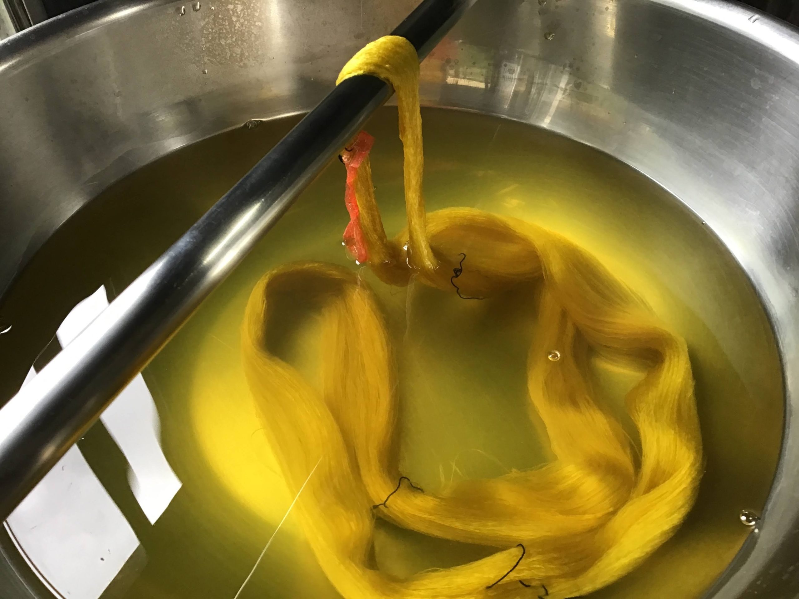 群馬県産の繭 ぐんま200から上州座繰り機で糸を引き灰汁による自然の精練 上野村の植物による草木染めを経てシルクストールを織っています。